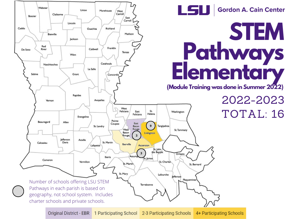 LSU Pathways for elementary school consists of STEM modules designed to help students get excited about STEM subjects. LSU Pathways provides training modules to teachers and schools interested in providing these modules.